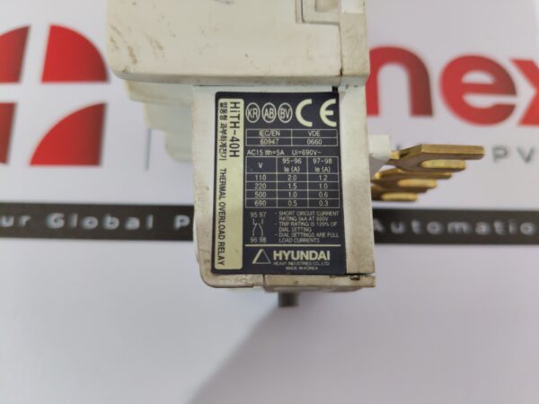 Hyundai HITH-40H Thermal Overload Relay 5A AC15 hyundai heavy industries co., ltd hith-40h thermal overload relay iec/en: 60947 vde: 0660 ac15 ith=5a ui=690v~ short circuit current rating 5ka at 600v trip rating is 120% of dial setting.